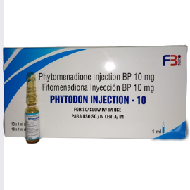 Presentación: 10mg/1ml por ampolla Uso: Se usa para prevenir las hemorragias en personas con problemas de coagulación o con muy poca vitamina K en el cuerpo. Dosis: Según recomendación médica